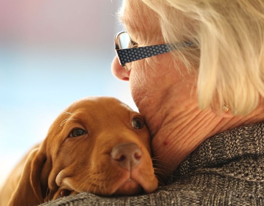 Een jonge hond die steun en nabijheid zoekt.
